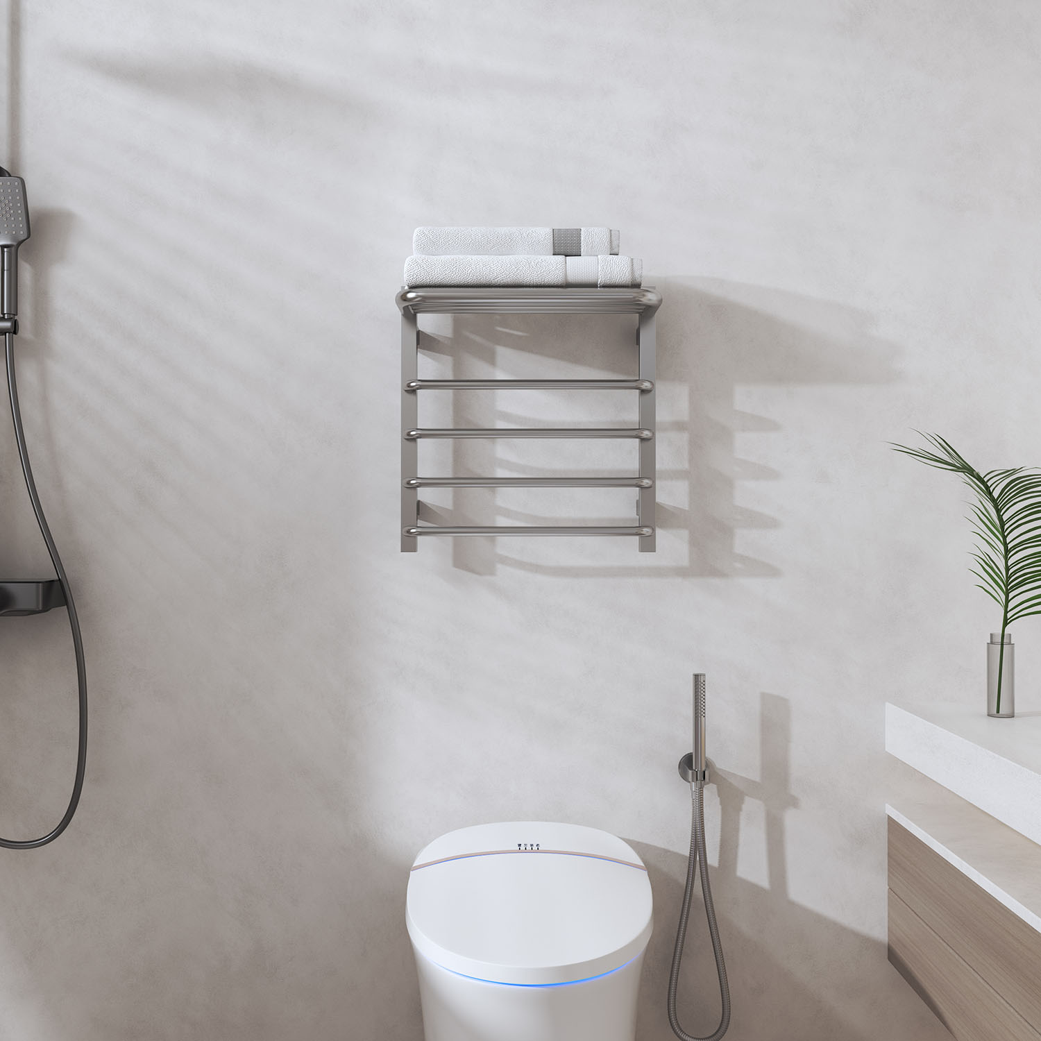 8桿時控開關電熱毛巾架 8 bar time switch heated towel rail 材質Material:SS201/SS304 功率Power:220V/95W 表面Surface:Mirror Polished 鏡面拋光 尺寸Size:480*250*500mm 包裝Ctn size:500*270*530mm