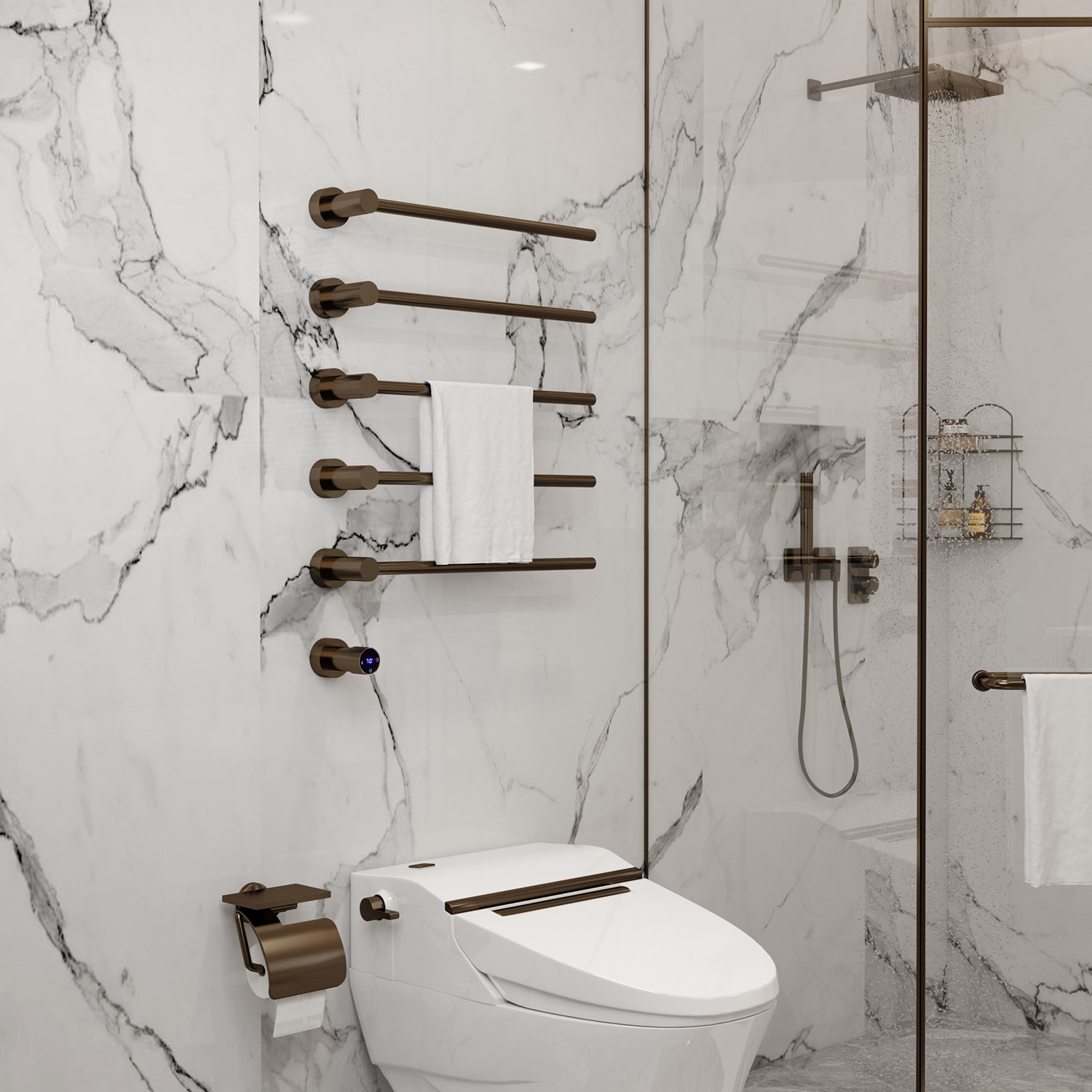 單桿預埋旋鈕開關電熱毛巾架 Single lever embedded knob switch electric towel rack 材質Material:SS201/SS304+銅 功率Power:220V/75W 表面Surface:Mirror Polished/Gun Grey/Blac k Painted 鏡面拋光/槍灰/黑色噴塑 單桿尺寸Single Rod Size:565*118*150mm 包裝Ctn size:710*110*410mm