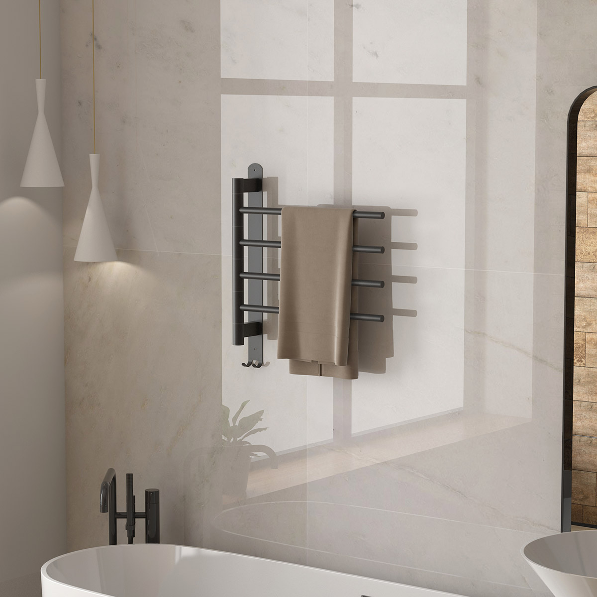 4桿電熱毛巾架 4 bar heated towel rail 材質Material:SS201/SS304 功率Power:220V/60W 表面Surface:Black Painted 黑色噴塑 尺寸Size:500*95*573mm 包裝Ctn size:520*60*580mm
